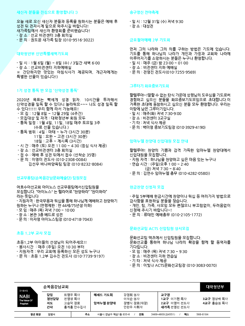 2020년도 1월 첫째 주일 청년주보 '나비' 2019년도 12월 성탄축하 청년주보